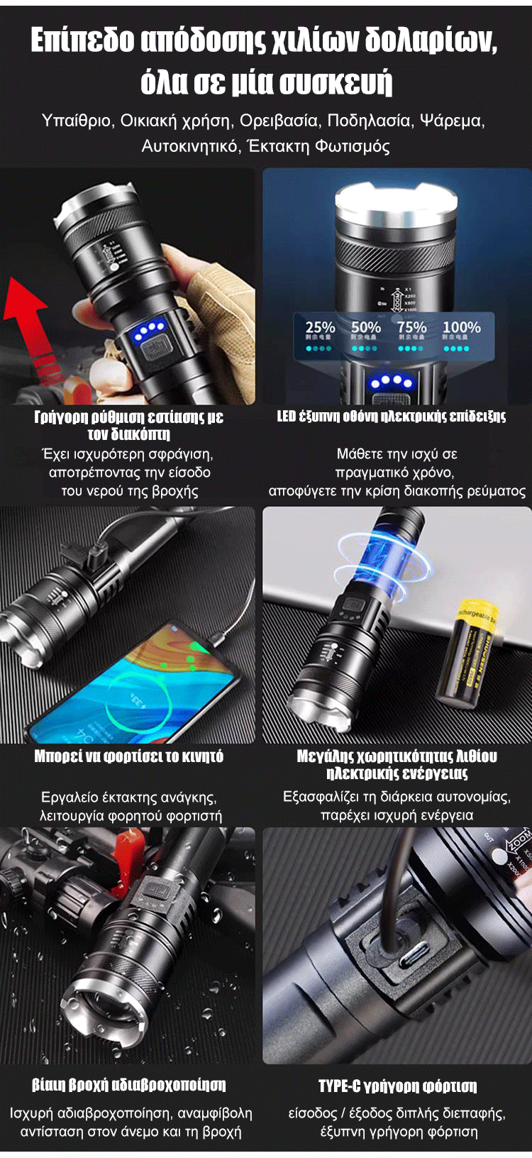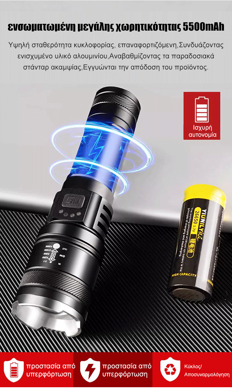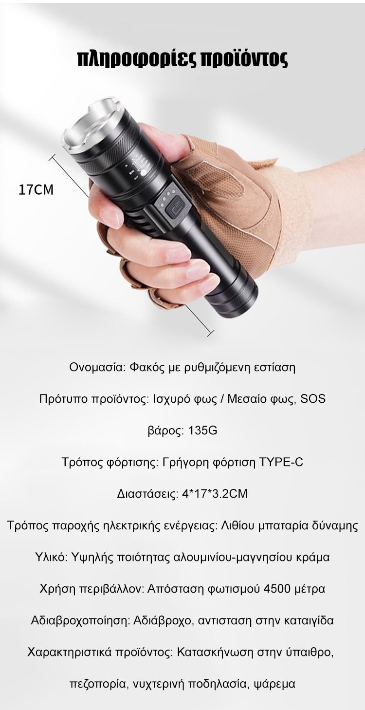 Φακός LED με ισχυρό φωτισμό, επεκτεινόμενος και ρυθμιζόμενος για εξωτερική χρήση.